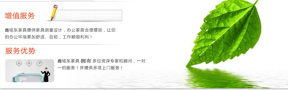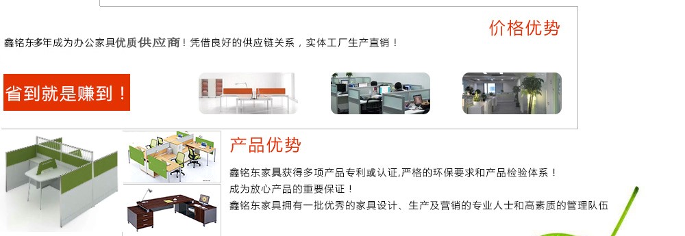 深圳市鑫銘東家具有限公司專業銷售各類辦公家具!產品涉及多種系列,如:班臺、班椅、屏風、會議桌、會議椅、辦公沙發(fā)、茶幾、辦公桌、文件柜、電腦桌椅、各式餐臺、餐椅、書柜等辦公家具。 鑫銘東家具擁有一批優(yōu)秀的家具設計、生產及營銷的專業人士和高素質的管理隊伍。銘東家具以"先難后易"之戰(zhàn)略,在產品結構、產品質量及服務水平方面,均推陳出新,力求完善,精益求精。使我們的產品質量保持在國內外家具潮流的先進水平,力求滿足客戶的特殊需求。鑫銘東家具多年來致力于環(huán)保、實用家具的設計與開發(fā),集生產、銷售、服務于一體。本著"以人為本"的設計理念,大量開發(fā)符合人體工程學的各種產品,以"誠信為本"的質量方針,真材實料,認認真真做產品,實實在在做人。鑫銘東家具更致力于創(chuàng)造"零維修率"的制造境界,實現"沒有維修的服務才是最好服務"的口號》了解更多